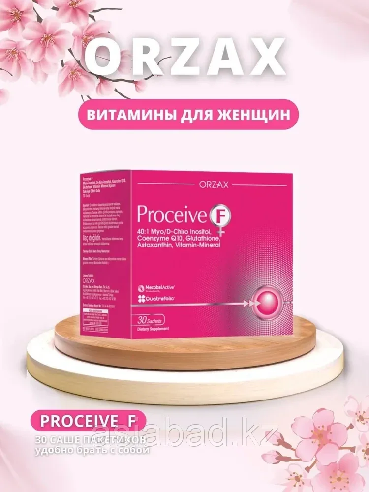 От состояния женского здоровья зависит и общее самочувствие, поскольку сохраняется нормальный баланс гормонов, поддерживается состояние нервной системы. Важным остается и вопрос функционирования репродуктивной системы, отсутствие серьезных проблем с ее составляющими, возможность зачатия и вынашивания ребенка. Регулярные стрессы в современном мире, несбалансированное питание, экология и ряд других факторов могут негативно сказаться на состоянии здоровья. Поэтому каждой женщине необходимо регулярно поддерживать свой организм. Биодобавка Proceive F укрепляет общий иммунитет и благотворно влияет на репродуктивные органы. Proceive F незаменимая вещь для каждой женщины!Состав: • Инозитол (Miyo Inositol + D-Kiro Inositol) 2000 мг. • Витамин C 180 мг. • Экстракт виноградных косточек 100 мг. • Магний 100 мг. • Коэнзим Q10 100 мг. • Глутатион 50 мг. • Железо 17 мг. • Цинк 15 мг. • Витамн E 12 мг. • Витамин B6 5 мг. • Астаксантин 1 мг. • Фолиевая кислота 400 мкг. • Селен 50 мкг. • Витамин B12 50 мкг. • Витамин D3 15 мкг.- Инозитол устраняет симптомы поликистозных яичников — серьезной патологии, нарушающей гормональный баланс у женщин и приводящей к бесплодию.- Витамина С для женщин полезен при борьбе с возрастными изменениями кожи, пигментацией, регулирует метаболизм, налаживает менструальный цикл, улучшает работу головного мозга, повышает уровень энергии.- Виноградные косточки обладают противовоспалительными свойствами и полезны в лечении колита, гастрита, инфекций мочевыводящих путей и кишечника.- Магний поддерживает нормальную функцию нервной и сердечно-сосудистой систем.- Коэнзим Q10 повышает уровень фертильности у женщин, уровень этой способности у женщин снижается вместе с возрастом в связи с ухудшением производства яйцеклеток, в котором коэнзим Q10 принимает непосредственное участие.- Глутатион устраняет свободные радикалы, замедляя процесс старения организма. Способен нормализовать содержание сахара в крови, стимулирует пищеварение, ускоряет процесс регенерации клеток после физических нагрузок.- Железо участвует во множестве биологических процессов и, в первую очередь, в передаче кислорода в ткани и мышцы.- Цинк участвует в восстановлении клеток кожи, волос, ногтей.- Витамин Е у женщин участвует в регуляции менструального цикла и смягчает неприятные симптомы при климаксе. Также важен для полноценного питания эмбриона улучшает усвоение питательных веществ клетками.- Витамин B6 облегчает протекание ПМС, снижает риск преждевременных родов, а также помогает легче пережить период менопаузы.- Астаксантин внешняя защита организма.- Фолиевая кислота Его главная роль - подготовка организма женщины к нагрузкам во время вынашивания ребенка и профилактика развития патологии плода.- Селен распространяется на синтез половых гормонов и на процесс образования половых клеток. Крайне необходим селен для организма женщины, особенно если речь идет о беременных женщинах.- Витамин В12 необходим для многих важных гормональных и метаболических функций организма.- Витамина D для женщин стимулирует регенерацию клеток и повышает защитные свойства кожи, уберегая ее преждевременного старения и сокращая проникновение в организм патогенных микробов.Рекомендуемая суточная доза: добавить 1 пакетик на 1 стакан воды (200 мл) и выпить, смешав. 1 упаковка рассчитана на 1 месяц использования.О