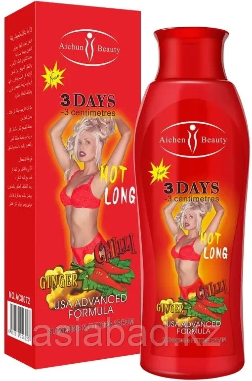 3 Days - антицеллюлитный крем чили для похудения от косметической компании Aichun Beauty, специализирующейся на выпуске товаров для красоты, молодости и похудения. Предназначен для использования на любом проблемном участке тела (бедра, ягодицы, живот, область талии, на боках, руки, ноги). Название крема 3 Days (в переводе на русский -3 дня) отражает тот факт, что за 3 дня применения гарантированно достигается снижение объема в области талии на 3 сантиметра. Крем поможет сократить локальные жировые отложения, подтянуть и укрепить кожу в проблемных зонах. За счёт выраженного разогревающего действия перца чили, улучшаются обменные процессы в коже и уменьшаются проявления целлюлита. Данный состав препятствует отложению жиров и выводит все токсические вещества из организма. Уже после нескольких применений можно увидеть эффективность нанесения крема: тонус, эластичность и упругость.